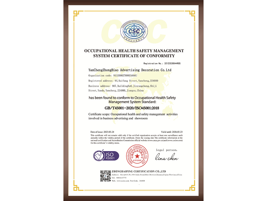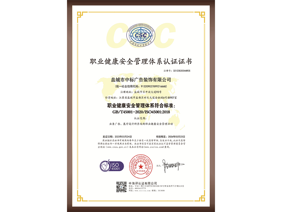 職業(yè)健康安全管理體系認證證書